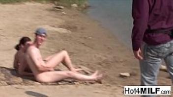 On the beach, a busty MILF with natural tits adores