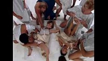 With three girls, Cum swallow exchange creampie gangbang
