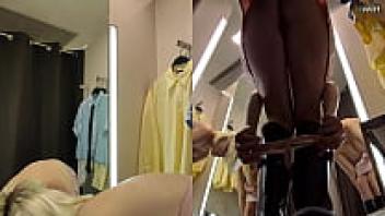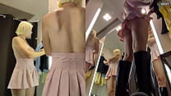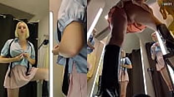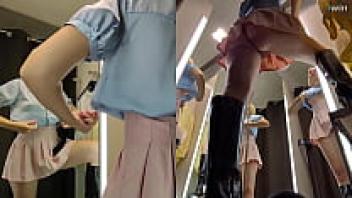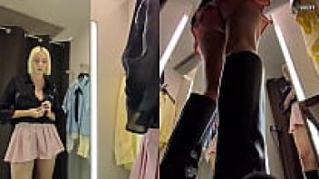 The dressing room has a hidden camera. View from the upskirt of a juicy PUSSy