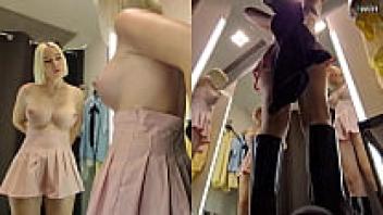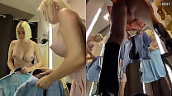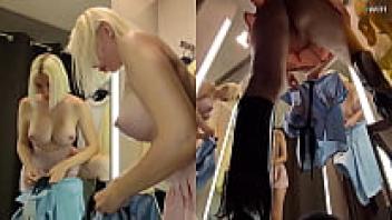 Upskirt view of a blonde's large tits in a public changing room