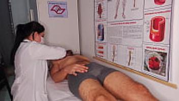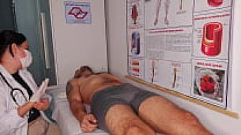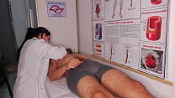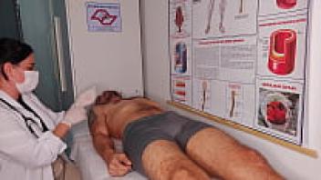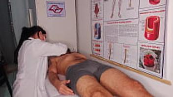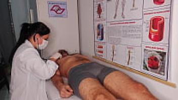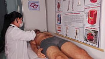 The nurse induces a really difficult erection in the patient.