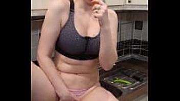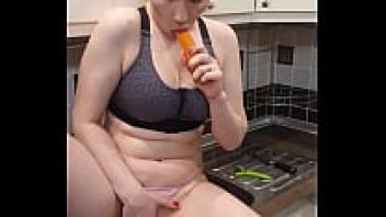 In the kitchen, a lustful housewife is fingering her pussy with carrots.