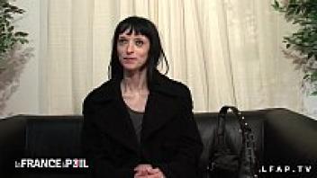 A slim French brunette in stockings is shown on an amateur anal casting couch.