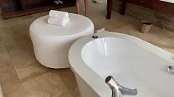 Vacation: Anal creampie in the bathroom with an amateur girlfriend