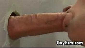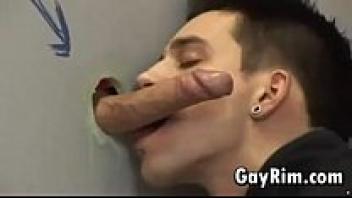 On the stage of a male gangbang house in Brazil, live gay three-way sex takes place.