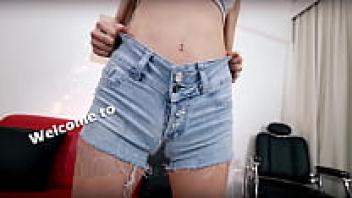 Brunette Babe with the Perfect Body and Ass in Tight Denim Shorts