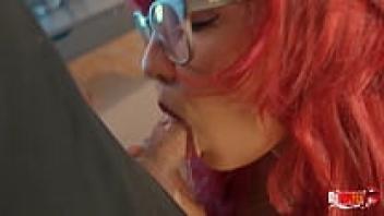 A gorgeous, attractive woman wearing glasses sucks and gets come in her mouth.