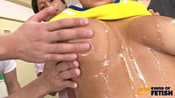 In the changing area, additional guys shower and adore a curvaceous Japanese cheerleader.