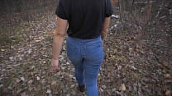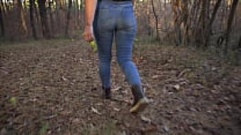 beneath a skirt without underwear. In nature, a large ass and hairy pussy in a short dress climb mountains.
