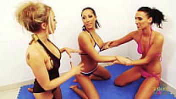 These three pussy pierced lesbians like wrestling before having group sex.