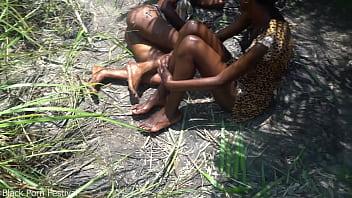 Three witches from an African tribe are performing a dance ritual to create rain.