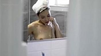 TABOO FAMILY: While watching his stepmother take a morning shower, the voyeur stepson masturbate.