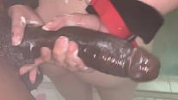 A tiny, obedient 18-year-old white bitch is handcuffed in the shower while worshipping a massive, enormous black penis.