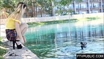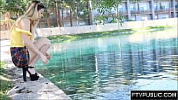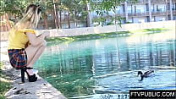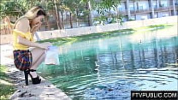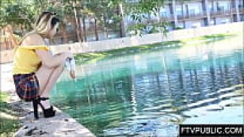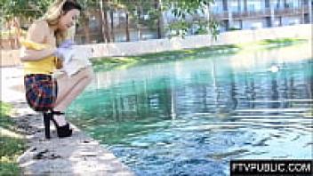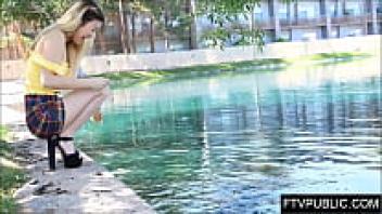 On a public nude beach, a naked girl pisses and masturbates.