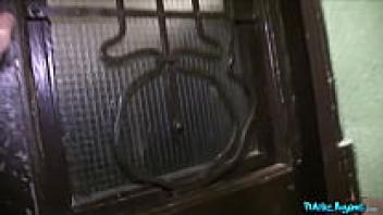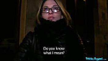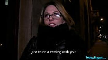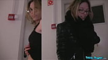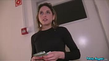 A gorgeous brunette battles two enormous European cocks in a fake hostel.