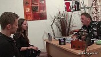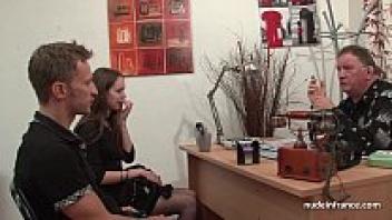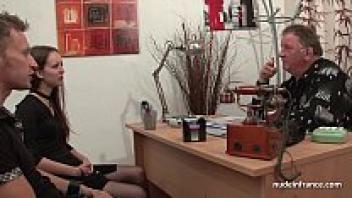 A slim French brunette in stockings is shown on an amateur anal casting couch.
