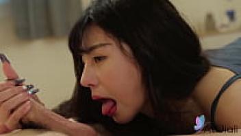 Before engaging in passionate love, gorgeous Chinese brunette Lina blows a man's cock.