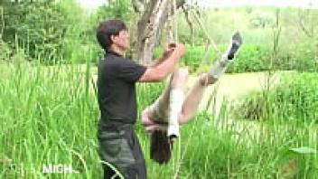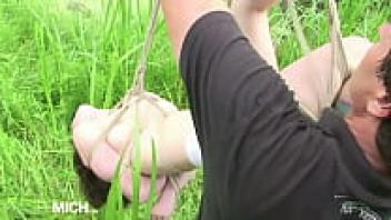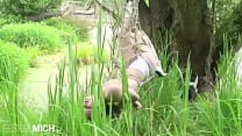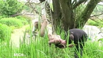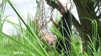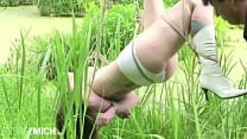 A lustful, nude blonde is bonded and shackled to a tree before being shown to the public.