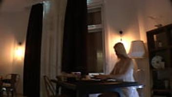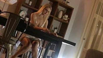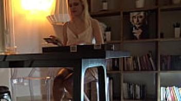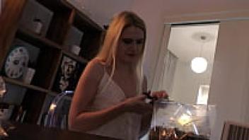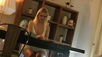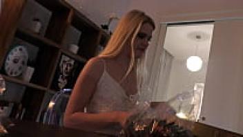 An all-natural, gorgeous blonde wife with enormous breasts in a seductive white summer dress teases to entice