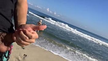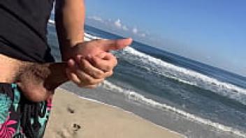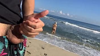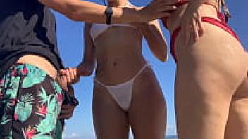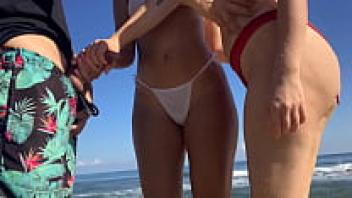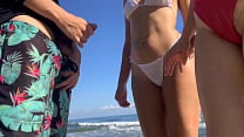 Two lustful chicks watch an exhibitionist voyeur display their dick on a public beach.