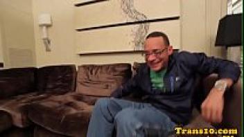 Tgirl doggystyled in stockings on the couch