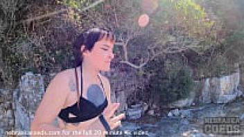 Katty West, a naked hottie, masturbates in public on a nude beach.