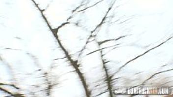 By a major highway, a petite teenage girl engages in a public sex gangbang threesome.