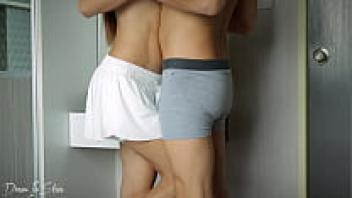 Sex while standing. A slender, skinny brunette gets sperm on her titts.
