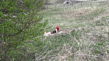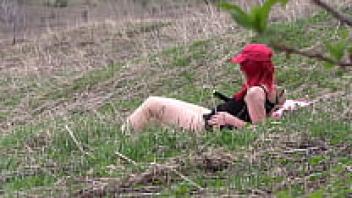 Voyeur spys on a female with a large ass who masturbates outside. Organic masturbation with a cucumber.