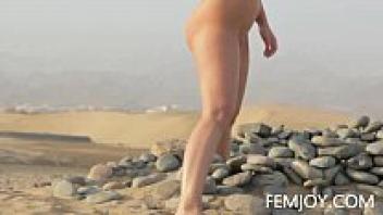 Beautiful woman masturbating on a public beach while nude