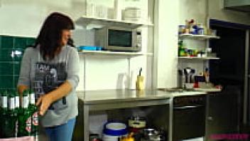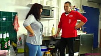 Horny busty milf gets hit in the kitchen.
