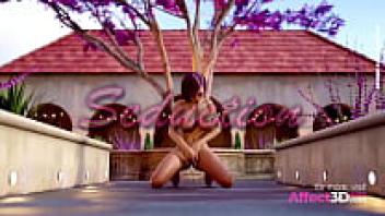 In a 3D animation, gorgeous women wearing high heels engage in futanari sex in a garden.