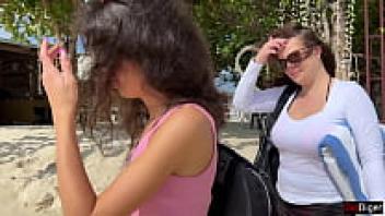Stepmother and Stepdaughter Picked Up in Public on the Beach: Dangerous Dick Flashing Cum on Face