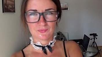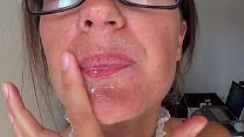 A female wearing glasses was caught masturbating Dildo while being face-loved and hard-loved.
