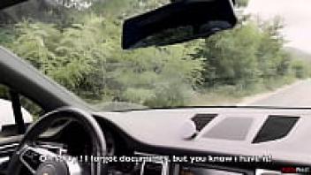 By a major highway, a petite teenage girl engages in a public sex gangbang threesome.