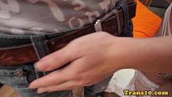 Cockrides of a lingerie ladyboy wearing stockings