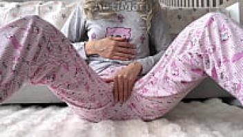 Slender teenager in pyjamas squirting climax and fingering a hairy, horny, moist pussy up close
