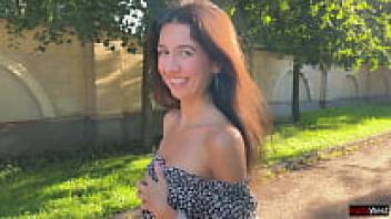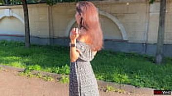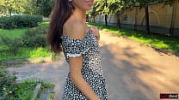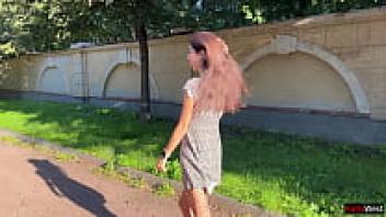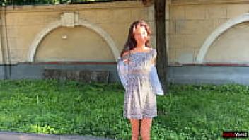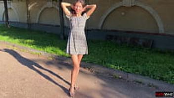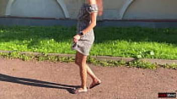 Exhibitionist girl in park at morning. Upskirt, no panties and flashing boobs and pussy in public.