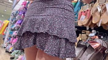 A sexy teenager without underwear in a short skirt at the store