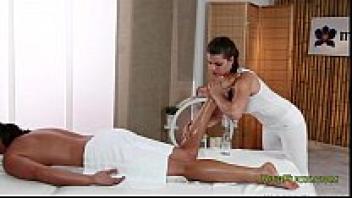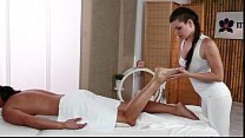 On the massage table, a masseuse adores an oily female with cumshot on her greasy tits.
