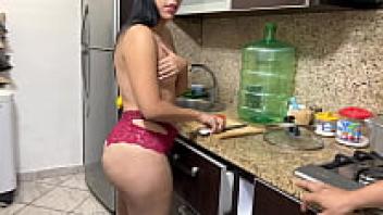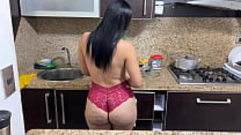 My gorgeous stepmother cooking in a bikini gave my stepson a hard time when he saw my ass in the kitchen and refused to leave.