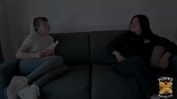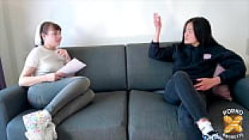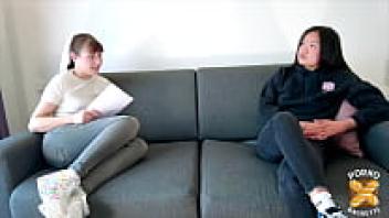 Nozomi Koizumi, a Japanese brunette, groans while uncensoredly blowing her friend's cock.