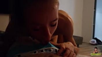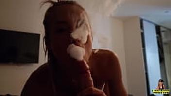 A wealthy girl gives a young guy oral sex and then eats his milk.