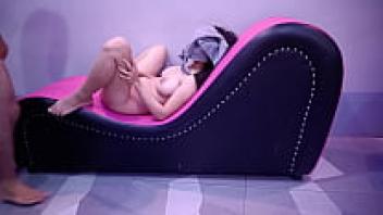 Ami, a horny babe, pumps her hairy pussy with her fingers and fists until she squirts.