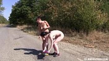 Teenage lesbians skate naked and dildo their pussies outside.