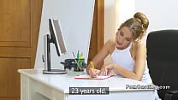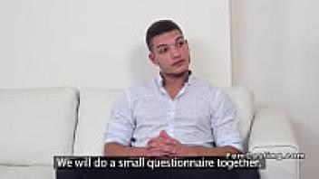 A slim French brunette in stockings is shown on an amateur anal casting couch.