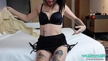 A stunning Korean girl in a hotel room in Bangkok is sucking a massive white cock.