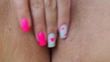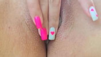 Close-up of a hot female with a yellow manicure masturbating her youthful pussy