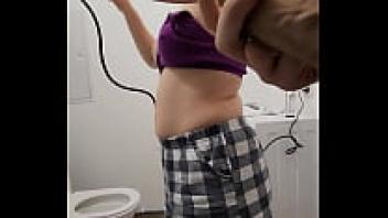 In the shower, the stepsister observes her brother jerk off on her large tits.