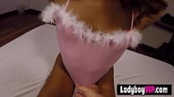 Skinny Thai ladyboy teen in a pink bunny costume POV blowjob